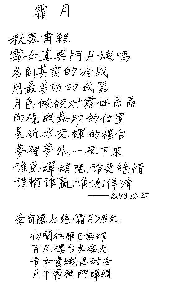 青女素娥俱耐冷 月中霜裡鬥嬋娟