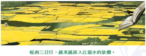我們重新上路,我卻十分感動。真羨慕這些無憂的孩子,後有九華巍巍的靠山,前有春色無際的油菜花田,功課壓力顯然還輕,青春的活力一時還揮霍不盡,夢的翅膀還沒有長齊,鄉愁更無從說起。弱水告訴我,這一帶曾經是朱元璋大將常遇春備兵之地,後來又跑過長毛,躲過日寇。但目前皖南這一帶,包括宣州、池州、徽州等地